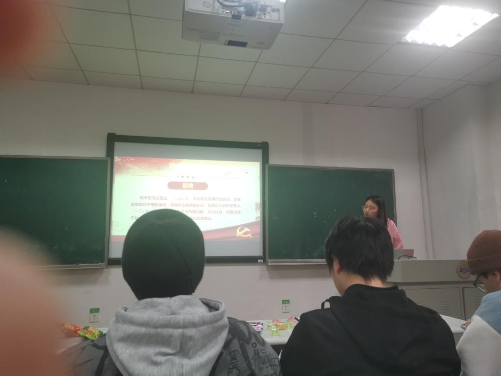 对祖国的认可是一个人健康成长的基础,为了加强民族团结,使学生深刻了解运动,激起学生的爱国热情,从而使学生能刻苦努力学习知识,本班特举办此次团日活动。活动中杨琳琳同学通过播放“一二•九”运动视频、照片和详细介绍等方式,让同学们了解爱国运动的背景、过程及其历史意义。学生们通过在活动中的交流分享,深刻领悟到爱国学生英勇奋斗的精神,进一步激发了学生们的爱国热情和历史责任感。在讲解完“一二•九”运动,领略了先辈的不易后,杨琳琳同学沿历史发展线,向同学们展示了近代以来各时期的重大历史事件。“历史长河奔腾不息,有风平浪静,也有波涛汹涌。”铭记历史,缅怀先烈,珍惜当下,展望未来。作为祖国的新一代,更应该注重新时期的传承。因此,杨琳琳同学就新时期的传承再次展开讲解。新时代新时期,作为新一代的大学生们应坚定理想信念,志存高远,以更加昂扬的精神状态,刻苦钻研,勤奋学习,做新时代中国特色社会主义的合格建设者和接班人。