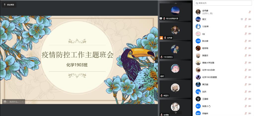 持续时长两周的园区隔离生活迎来了尾声,999策略白菜手机论坛天马学生公寓于4月9日正式解封。为了了解学生思想动态,帮助学生解决困难和问题,999策略白菜手机论坛999策略白菜官方网站化学1903班于2022年4月17日晚上19时借助腾讯会议线上平台举行了“疫情防控工作”主题班会,本次班会邀请到了原化学类1903班班主任刘强老师参会,由团支书周文主持,化学1903班共26名同学参加,2人请假。