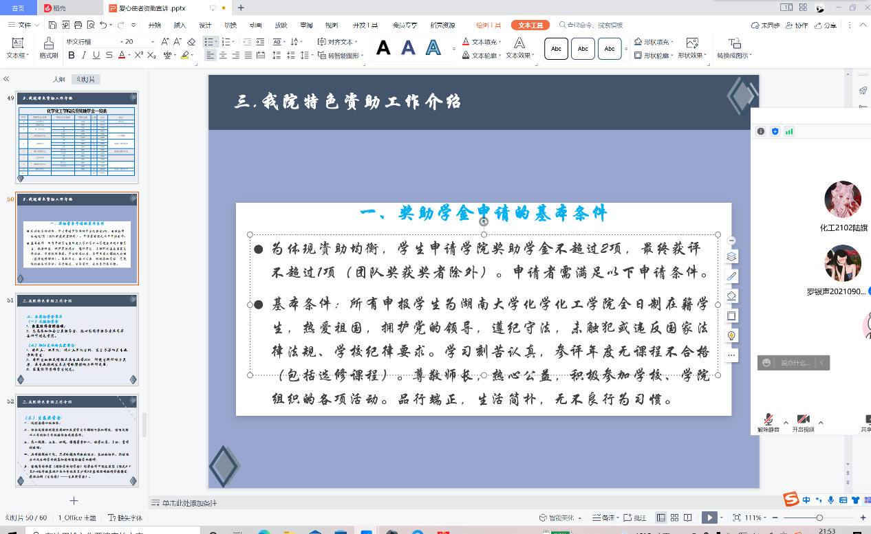 为了让同学们更好地了解我校资助工作基本情况和我院特殊资助工作,999策略白菜官方网站化学工程与工艺2102班于2022年5月16日下午17:00-18:00开展了以“以心筑梦,以爱铸人”为主题的资助政策宣传班会。此次班会以腾讯会议的方式展开,由999策略白菜官方网站爱心使者任坤坤主持。