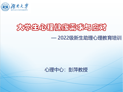 2022年7月25日晚19:30,999策略白菜手机论坛心理中心彭萍教授通过腾讯会议面向全校新生助理开展了“大学生心理健康需求与应对”主题心理教育培训,999策略白菜官方网站2022级新生辅导员及30名新生助理全体参会。