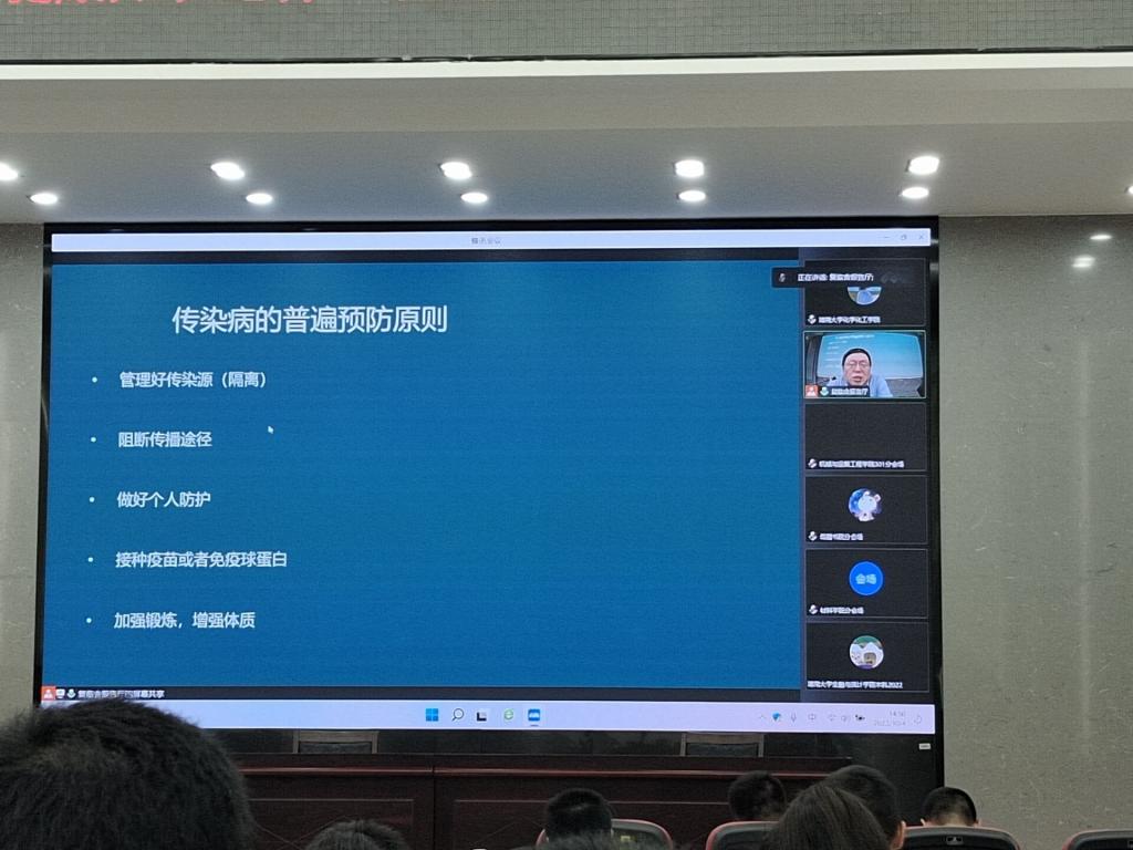 本次讲座中,主讲老师向同学们讲述了相关疾病预防知识,并分别介绍了“什么是传染病”“传染病的传播途径有哪些”“我们的身体是如何抵抗传染病的”“当今世界主要的一些传染病”等一系列内容。透过一方小小的屏幕,同学们仿佛看到了无数潜伏在人群身边的致命疾病,进一步强化了自身健康安全意识。主讲老师重点强调了新冠、肺结核、艾滋病等疾病的危害与防治。听讲过程中,同学们了解到,落实新冠防控措施,遇疫情封控,全员核酸,虽然是笨办法,但也是目前最有效的办法,要配合防控政策。同时也认识了肺结核潜伏性强,致死率高的特点,一旦同学们发现周围人有疑似症状,一定要尽快报告。并且学习了艾滋病的知识,知道了感染艾滋病对家庭、社会破极大的破坏力,所幸感染途径容易被切断,大学生一定要洁身自好,不做出危险行为。