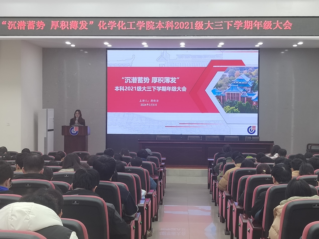 2024年3月5日18:30,999策略白菜官方网站本科2021级全体学生在新化工楼D区报告厅召开年级大会。本次会议主题为“沉潜蓄势,厚积薄发”,由本科2021级辅导员兼分团委书记蒋晓洁老师主持。