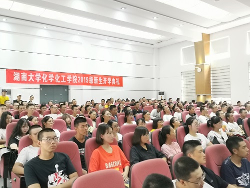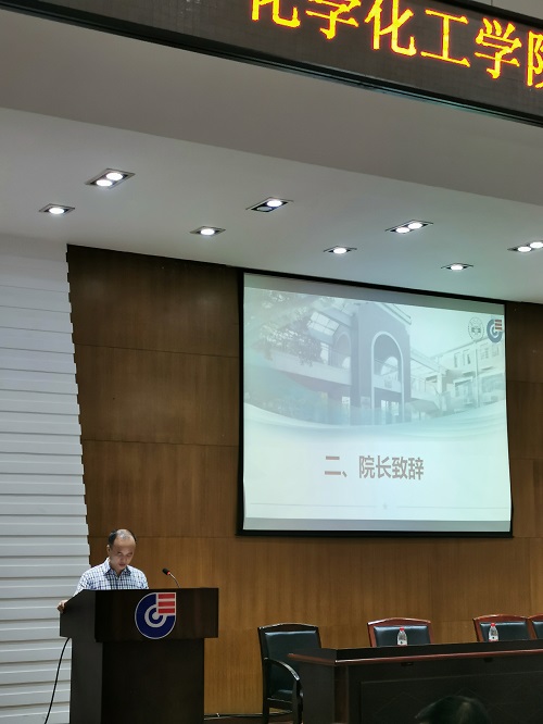 伴随着庄严肃穆的国歌,典礼正式开始。由学院院长张晓兵教授致欢迎辞,他首先对考入湖大化工院的19级新生们表达了衷心祝贺和热烈欢迎。不仅如此,张院长还在欢迎辞中勉励同学们在坚定信念上下功夫、在深入学习上下功夫、在协同创新上下功夫,立志成为德智体美劳全面发展的社会主义合格建设者和可靠接班人。最后他以众多杰出的学长学姐为例,鼓励大家与国家“两个一百年”相契合,成为驱动中华民族伟大复兴的蓬勃力量。