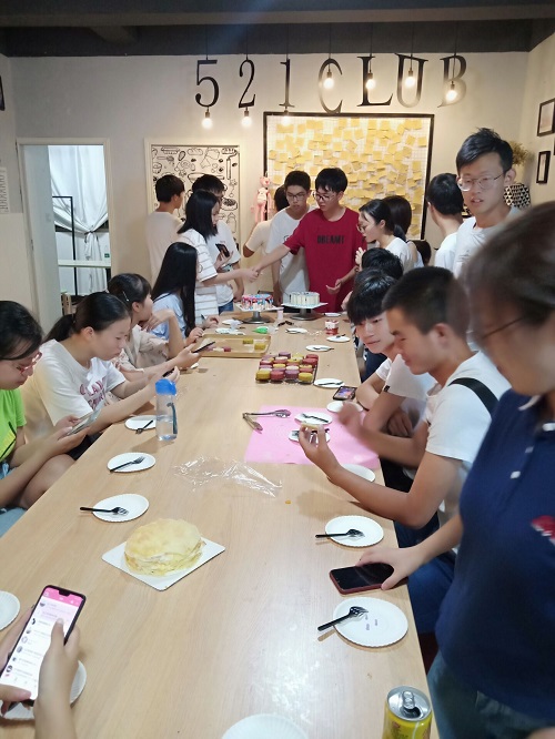 活动的最后一个环节是制作饼干和千层蛋糕。在此过程中同学们发挥想象力用糖浆在饼干上绘制了笑脸,小熊等图案,制作饼干时两班同学轮流制作饼干。在千层蛋糕制作环节由两班同学共同合作,一部分同学负责在蛋糕上涂上奶油,另一部分同学在奶油上洒上水果粒。在完成制作后,同学们开始分享千层蛋糕,以及在制造过程中的体验。活动结束后两班进行了合影,每位同学还带走了自己亲手做的月饼。