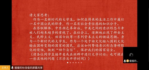 本次线上主题班会由班委组织落实,班长杜佳俊作为主讲人主持召开,班会结合十九大报告中关于坚持总体国家安全观的内容,向班级同学宣传公共卫生安全、生物安全等非传统安全知识,活动伊始,同学们观看了一段关于“全面国家安全教育”的视频,对国家成立安全教育日的意义有了一个更清晰的认识。随后,班会切入正题,班长杜佳俊简要阐述了国家安全的含义以及国家安全问题研究的发展历程,自新中国成立以来至今,国家安全从基础阶段到走向完善经历了整整七十年的岁月,逐渐得到重视,并通过立法的形式确立下来。杜佳俊同学对这一历程进行了深入的剖析,接着进入第二部分,国家安全在新时代具体方面的体现,主要有政治安全,国土安全,军事安全,文化安全,生物安全,信息安全等,这种种的安全问题所牵涉的范围十分广泛,比如钓鱼岛、南海主权问题,恐怖组织,黑恶势力等危害国家稳定和民族团结问题,同学们听得热血沸腾,李畅同学线上发言发表自己独特的看法,她谈到当下新冠肺炎这类重大生物安全问题,同学们都应该意识到,国家安全与每个人的生活都是息息相关的,置身于国家中的每一个民族,集体,个人都应当主动关心与国家安全有关的事务,并负担起相应的责任。同学们深受启发,接二连三地谈了自己的体会。发言结束,会议承接到下一环节,杜佳俊同学从十九大报告中关于坚持总体国家安全观的陈述出发,指出当今中国与世界的关系发生着历史性的变化,从而面临着更多的压力和风险,新时代的中国面临着比以往任何时候都要复杂的考验,因此必须坚持总体国家安全观,努力打造以人民安全为宗旨,以政治安全为根本,统筹传统安全和非传统安全,为决胜全面建成小康社会提供坚强保障。进入会议的最后一部分,生物安全和公共卫生安全,会议中由团支书赵丽娟发言表示,目前发生于世界范围内的新冠疫情,中国在防疫面前始终把人民安全和利益放在第一位,同时在积极援助其他国家抗疫面前也充分展现了一个负责任大国的形象。民众在公共安全事件面前绝不仅仅是被动的、被保护的对象,同时也是积极应对公共安全事件的主体。作为特殊时期的青年人和知识分子,同学们更应该协助国相关部门强化法制建设、政府职能建设,坚决做到信息公开,不隐瞒,不谎报,杜绝一切对国家和人民安全不利的行为,主动提升自己应对疫情灾情的素质、切实把“预防为主”的方针落到实处。到此“国家安全教育班会”圆满结束。