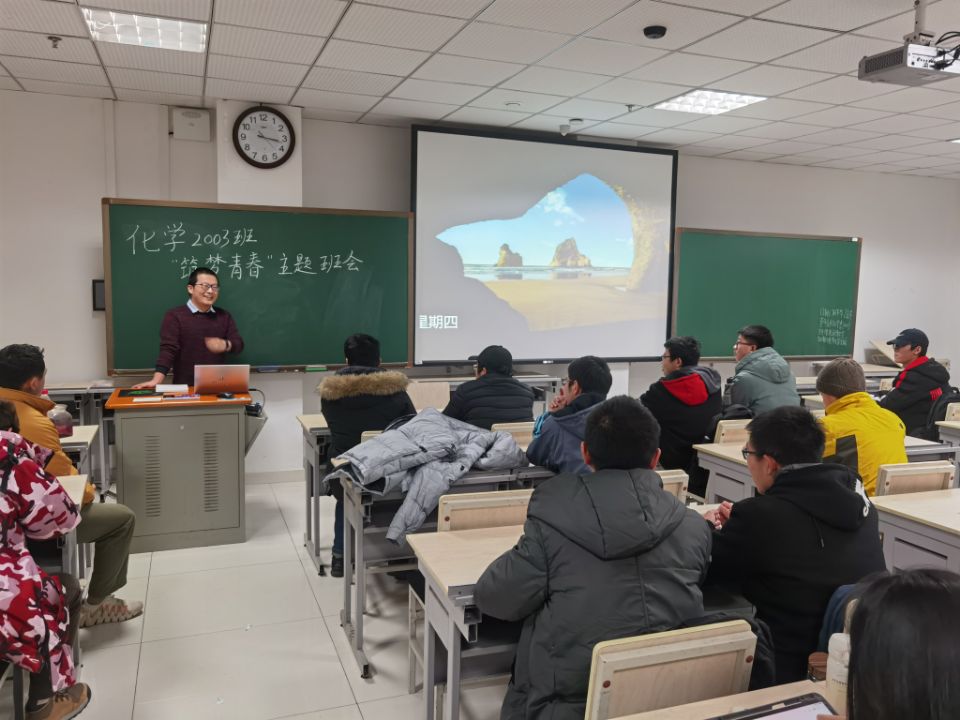 为总结期中考试成绩,规划班级未来活动开展方向,999策略白菜官方网站化学类2003班于12月21日下午2点30分,在研究生楼A104教室开展“筑梦青春”主题班会活动。本次活动由团支书李珂瑾主持,班主任李昆老师、化学2003班全体成员参加。