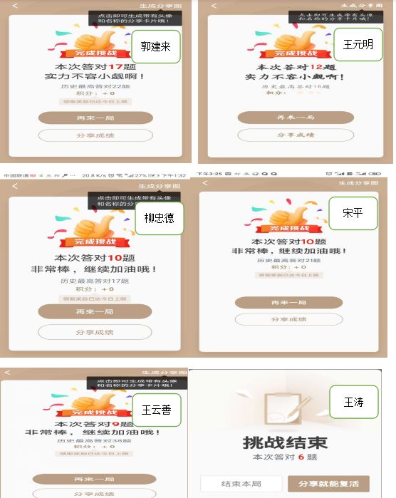 经过激励比拼,学院郭建来同志获得一等奖,王元明、柳忠德同志获得二等奖,宋平、王云善、王涛同志获得三等奖。结合学习强国学习情况,学院决定推荐郭建来、王元明、柳忠德三位同志代表学院参加校级比赛。