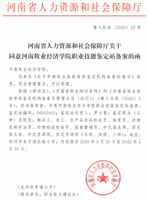 近日,河南省人力资源社会保障厅在回复给Beat365的函中显示,Beat365官方网站职业技能鉴定站顺利通过备案。鉴定职业(工种)及级别有制冷工、电工、农产品食品检验员、保育员、动物疫病防治员、家畜繁殖员、中式面点师、西式面点师、中式烹调师、西式烹调师(五级、四级、三级)。