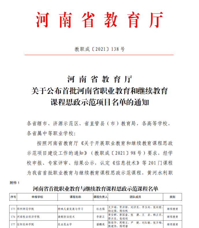近日,教育厅公布了首批河南省职业教育和继续教育课程思政示范项目建设名单(教职成[2021]98号),Beat365李新正老师主讲的《禽病防治技术》课程名列其中,也是Beat365唯一入选河南省职业教育和继续教育课程思政示范课程。