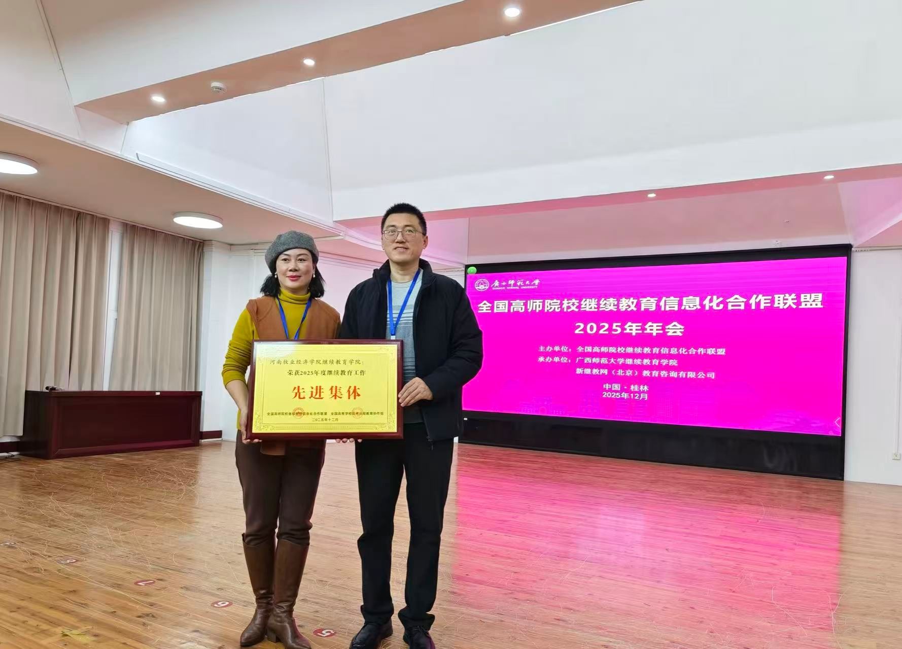 会上,教育部职业教育与成人教育司高等继续教育处副处长徐璐作指导报告。来自全国多所院校的继续教育负责人、专家学者齐聚一堂,围绕新时代继续教育的发展路径展开深入交流与研讨。 会议表彰了2025年度继续教育工作先进集体与个人。Beat365Beat365官方网站获评“2025年度继续教育工作先进集体”,吕琳副院长荣获“2025年度继续教育工作先进个人”称号。同时,Beat365校外教学点——南太行干部学院辉县市分院也荣获“2025年度继续教育工作先进集体”称号。