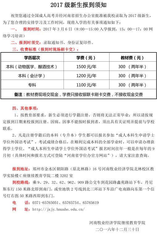 2017级成人教育学生报到须知