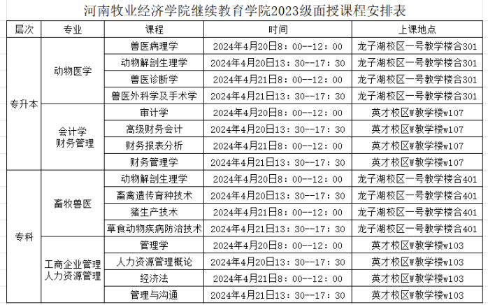 根据各专业培养计划和本学期教学进度,我院定于2024420日、21日共两天,在英才校区、龙子湖校区对2023级专升本和专科的6个专业进行课程面授。