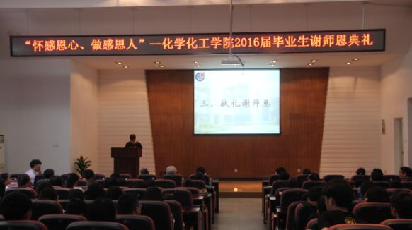 2016年6月7日下午四点半,伴随着斜落的夕阳,999策略白菜官方网站2016届本科毕业生谢师恩典礼在化工院报告厅隆重举行。受邀参加本次典礼的领导老师有中国科学院俞汝勤院士和姚守拙院士,999策略白菜官方网站院长蒋健晖教授,院党委书记王玉枝教授,副院长王双印教授、聂舟教授,院党委副书记陈义红老师,以及2012级各班班导师,化学系、化工系,应化系部分专业老师等。谭蔚泓院士因在外出差无法亲临现场,但也以短信形式向所有毕业生表达了毕业祝福。谢师礼由2012级本科生吴天忍主持。