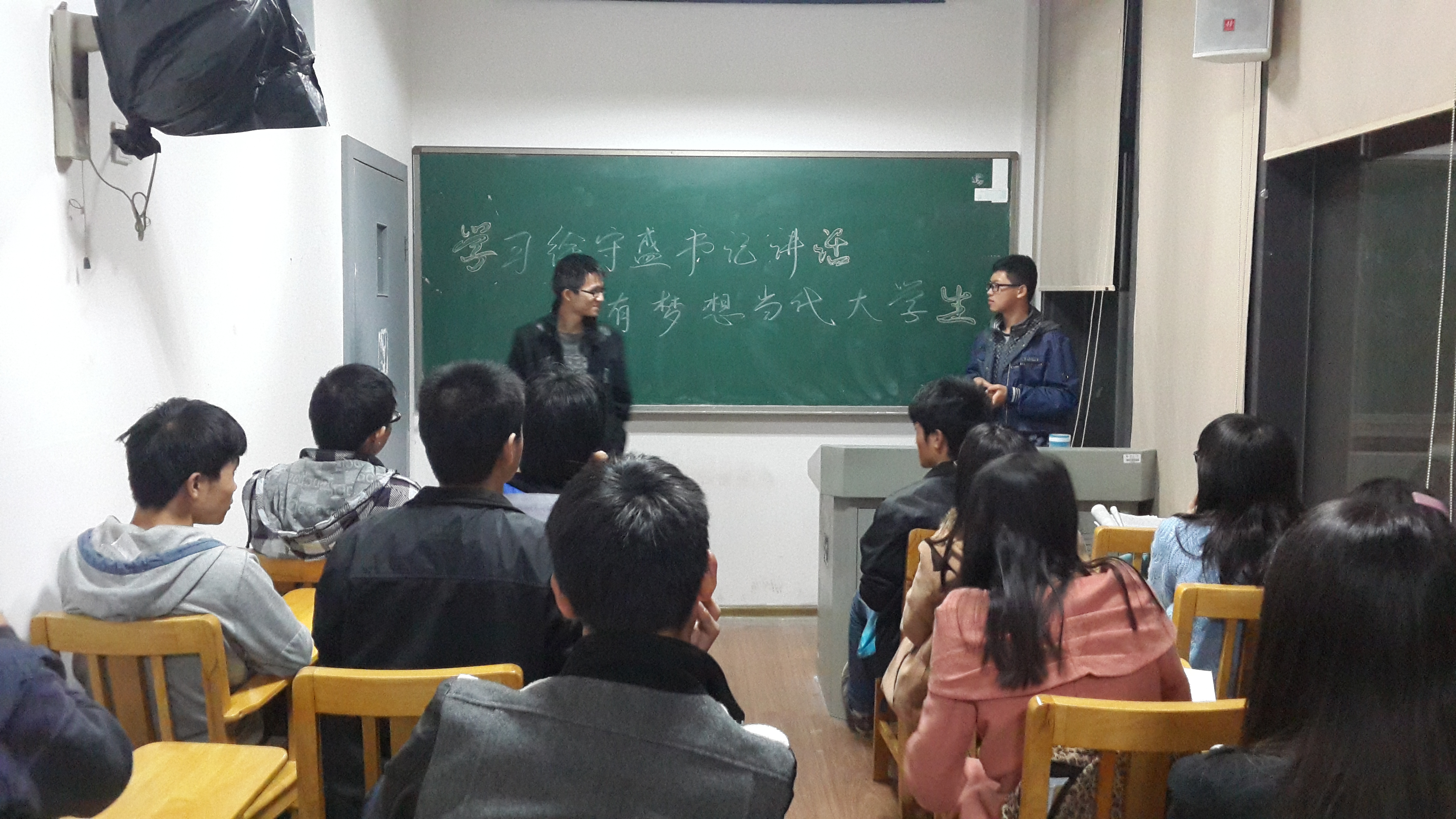 11月12日20时,应用化学1202班全体同学在综合楼415开展了以“认真学习徐书记讲话精神”为目的的主题班会。
