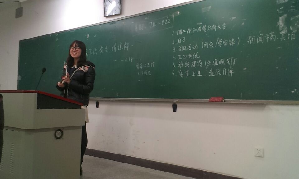 三月,是一个丰富多彩的月份。迎来了24节气的惊蛰之后,紧接着迎来了两会,同时,一年一度的学雷锋日也即将到来。班会的第一项就是成绩分析。首先,应化1301的班长对上学期期末考试成绩作了简短的分析与说明。不管什么时候,学习始终应该放在第一位。应化1301班的总体相比于前几个学期有明显的退步,对此,班长也积极号召同学们多上自习,希望班里的“学霸”去帮助学习上有困难的同学,期望在新的学期里大家都有所进步!