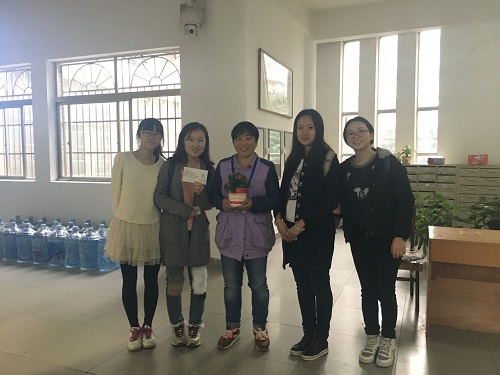 同学们都积极地行动起来。每个寝室都精心准备了小礼物与卡片,卡片上面写满了同学们想对他们说的话,字字真诚。在选择礼物的时候,同学们的考虑都特别周到,有的寝室给打扫楼道的阿姨送了手套,洗手液等日常生活品;有的寝室给宿管阿姨送了小盆栽,阿姨们平常没事的时候可以浇浇花;有的寝室了解到食堂的师傅们每天工作从早到晚,只有晚上才能回家,所以给他们送了保温水杯,希望天冷的时候,他们有热腾腾的水可以喝······