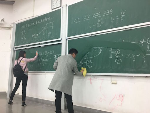 同学们每天坐在教室里,看着黑板上的板书学习知识,却很少有同学会在放学后主动将黑板擦干净。化工1402班的同学们决定借这次学雷锋的活动,将复临舍教室的黑板和讲台都清洁干净。