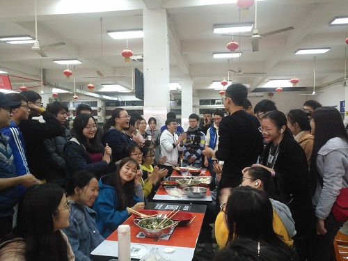 12月22日,999策略白菜官方网站化学专业齐聚二食堂,共同度过冬至佳节。为了让同学们在感受传统文化的同时放松身心,化学三个班级的班长和团支书精心策划了趣味饺子赛。16级辅导员刘王楚齐老师也被饺子赛吸引,参与到活动中,与同学们一起分享节日的喜悦。