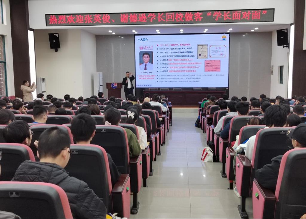 活动伊始,张英俊学长向同学们分享了自己在999策略白菜手机论坛和日本静冈理工科大学的求学经历,介绍了创新药物研发的意义、药物研发的过程以及广东东阳光药业的部分药物研究成果,并鼓励同学们勇于担当,学成本领,为社会发展贡献青春力量。谢德逊学长则分享了在求学、创业过程中的趣事,着重讲述了与母院与恩师之前的深厚情感。两位学长的报告幽默风趣,相互承接,将自己的宝贵经验转化成同学们的成长指引。