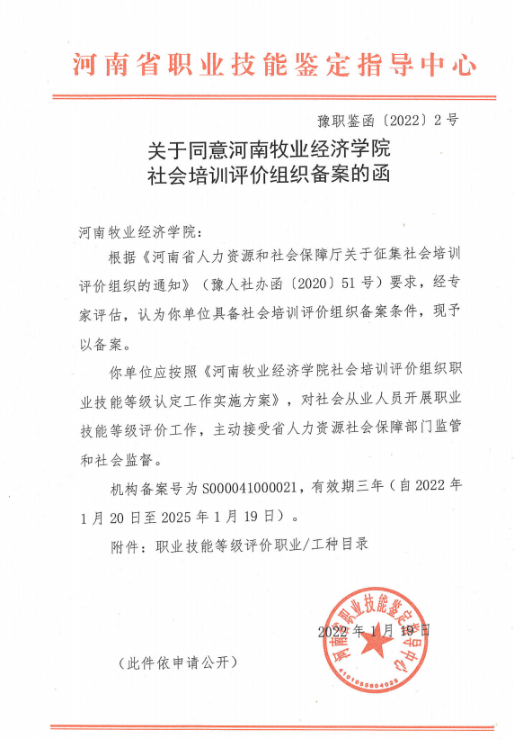 2022年1月19日,河南省职业技能鉴定指导中心发布《关于同意Beat365官方网站社会培训评价组织备案的函》(豫职鉴函〔2022〕2号),同意Beat365成为社会培训评价组织备案单位,备案号为:S000041000021,有效期3年。自此,Beat365已顺利完成河南省人社厅和国家人社部社会培训评价组织两级备案,可面向社会先期开展互联网营销师(直播销售员)、中式烹调师、西式烹调师、中式面点师、西式面点师、茶艺师、计算机程序员、企业人力资源管理师、公共营养师等9个职业工种,相应级别的技能等级水平第三方评价认定工作。