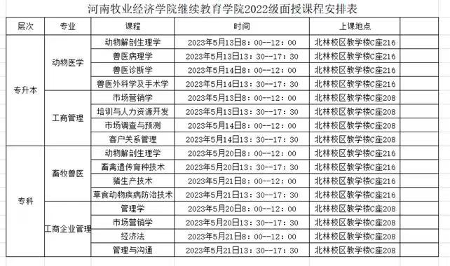 根据各专业总体教学安排和本学期教学进度,我院定于2023年5月13日、14日、20日、21日在北林校区进行2022级四个专业(动物医学、工商管理、畜牧兽医、工商企业管理)的课程面授,面授内容主要侧重以下方面:
