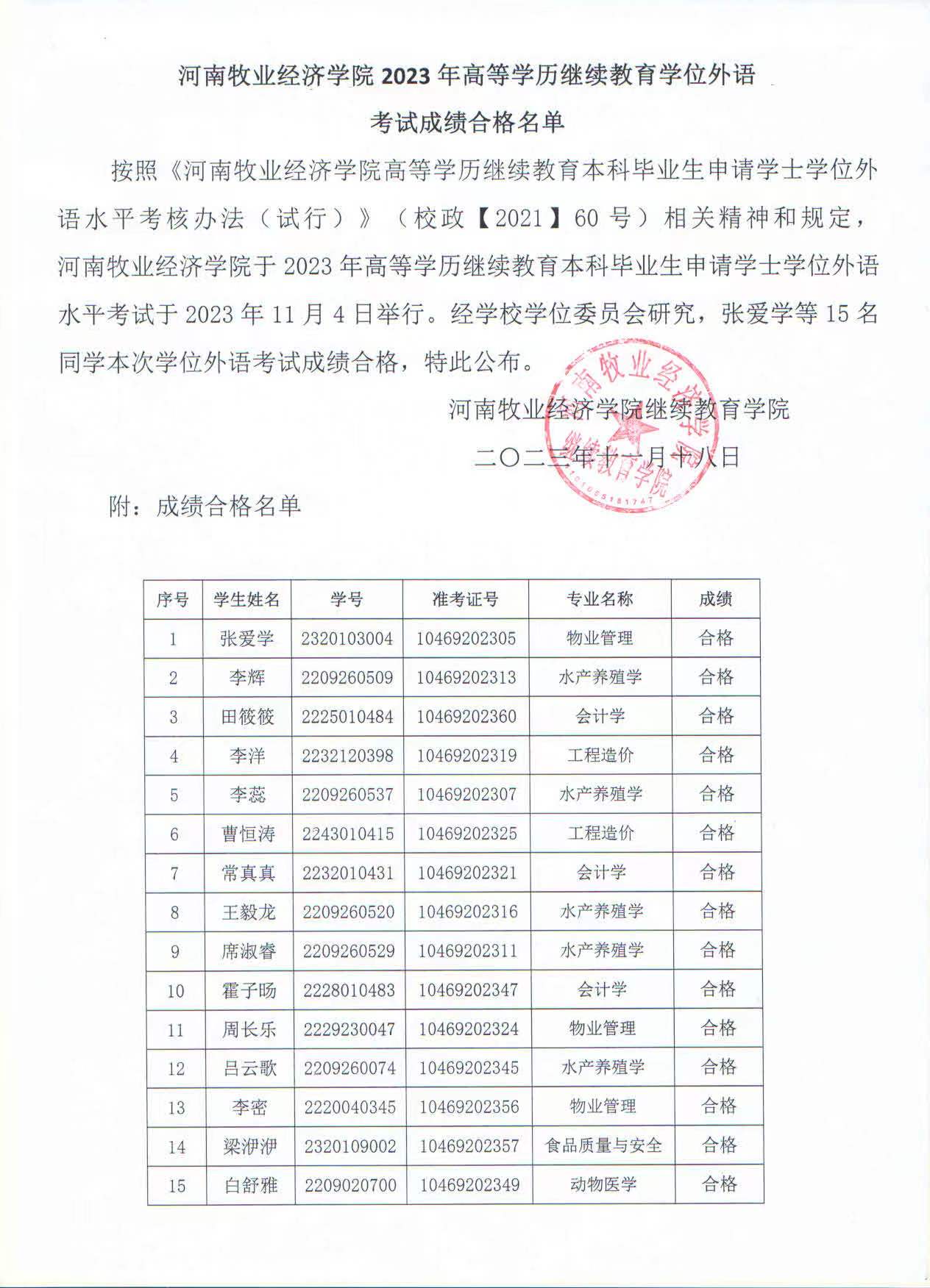 Beat365官方网站2023年高等学历继续教育学位外语考试成绩合格名单